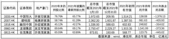 除了許家印家族之外,余下四大家族在上市地產公司的持股比例并無太大波動,但因為股價下跌,致使所持市值各自都蒸發了約350億港元-450億港元左右。綜合起來,五大家族持有的上市房企市值在2021年合計跌去2954億港元,相當于跌去了一個萬科的市值。